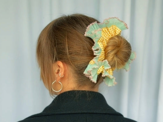Handmade yellow gingham ruffle scrunchie